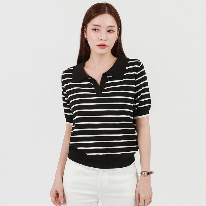 엘쏘 여성용 스트라이프 브이넥 카라 반팔 니트