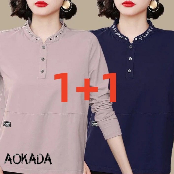 AOKADA 11 60대 엄마옷 빅사이즈 타이 꽃 자수 편안한 긴팔 티셔츠