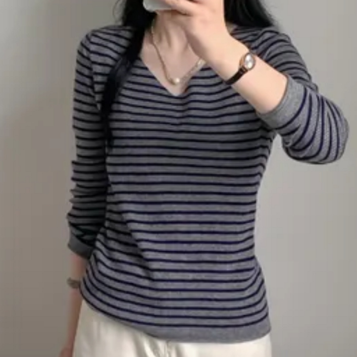 르코앤드라코 여성 데일리 스트라이프 브이넥 빅사이즈 니트 티셔츠